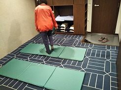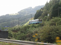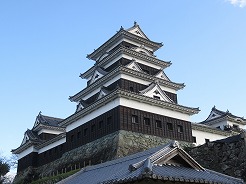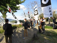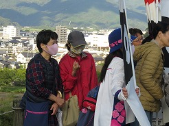 | 明日お城泊一泊100万円のお客が来て花火や太鼓で歓迎式典をするそうで、天守に行くと10名ほどが旗を持って何やら・・・明日のリハーサルかと見ていると、旗振りに参加して欲しいと・・・あと5分で観光列車が鉄橋にさしかかるので旗振りのおもてなしをするんだとか・・・ | ||