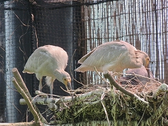 | フェリー乗り場へ向かう途中、大空に朱鷺色の羽ばたくのが見れたので近寄ってみると、野生のつがいが舞い降りて餌をついばんでいた。 | ||