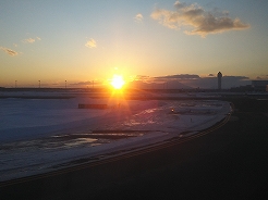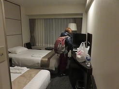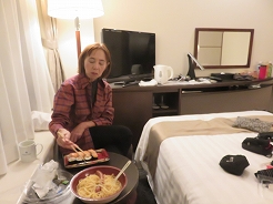 | バス停からホテルは間近に見えるが、車道には雪はないけど歩道はツルツルの氷状態・・・恐る恐る注意深く歩いてやっとこホテル着・・・今回はチープなホテルではなくでちょっとリッチなホテルを予約、ここに4連泊! 空港でバス待ちの間に買った夕食を温める電子レンジもないホテルだったのでフロントで温めて貰う・・・待っている間インバウンドが続々とチェックイン・・・19:30遅めの夕食・・・ |