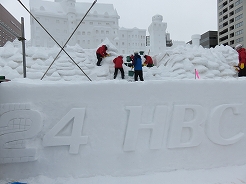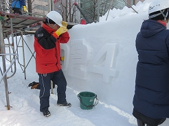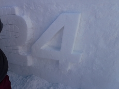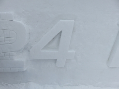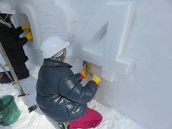| 今日は雪像制作最終日でステージ前面の「2024 HBC ドイツ広場」の文字彫り・・・ 我が家は二人で「4」の担当・・・手順はまず文字を荒く浮き立たせた後、深みが出る様に縁を彫り込み、仕上げに新雪でお化粧・成形する。・・・監督から上手に出来ていると褒められた。ちなみにHBCとはスポンサーの北海道放送。 |