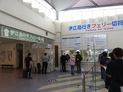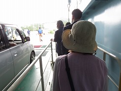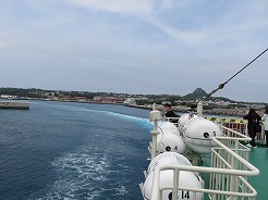 | 乗船が始まっているが駐車場がわからずウロウロ・・・道向かいに3階建ての有料駐車場があり最上階に空きを見つけてダッシュで切符売り場へ・・・その間修学旅行のバスが4台到着、大勢が列をなしだした。8:40乗船 昨夜泊まったヒルトンホテル瀬底島を見ながら 9:30下船 | ||