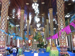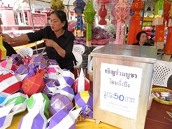 | サンデーマーケットを通って読経の行われる寺院へ・・・丁度飾り付け中で30分後読経が始まった。 | ||