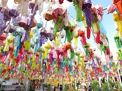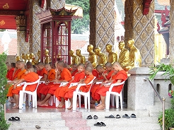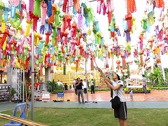 | 1418年建てられた、高さ46メートルの丸い黄金色の仏塔(チェディ)を持ち、今日が国王逝去から1ヶ月とあって寺院では読経が行われていた。ここは願い事を書いた色とりどりの飾り有名で我が家も・・・ | ||