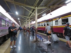 | 4:50あと5分でドムアン空港駅ですと車掌が告げながら席をたたむのどくようにとせかす・・・ありゃ〜〜ぁ外は真っ暗・・・予定では5時半着が2.3時間遅れるのが普通なので8時頃を見込んでいたのに6:00到着・・・どの情報誌を見ても、バンコク在住の方に聞いても必ず遅れる、遅いときは7時間とかだったのにぃ・・・で、早朝から空港チェックインまで12時間・・・さあ、何をしよう・・・ まずはメールチェックなどのスマホを見る事・・・で、10日前宿泊したファランポン駅前のホテルのwifiアドレスを覚えていたので電波の届く場所でスマホタイム・・・6:30案の定うまく繋がってポケモンGoとメールチェック完了。で、ここから川が近いのでボートに乗ってクルーズをしようと・・・ |