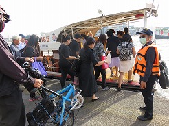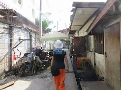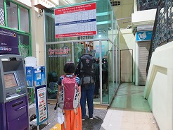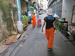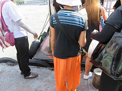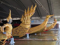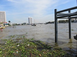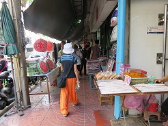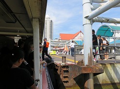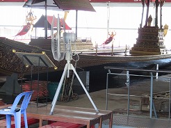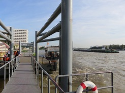 | 7:50船着き場へ・・・オレンジの旗は14B、8:1010トンブリへ。降りたら大きな商店街、露店が建ち並び人が大勢・・・ここは王様の使用するボートが展示してある博物館がある。途中大きな病院の中を通り歩いて20分で9:00博物館に着くが満潮で桟橋がプカプカ浮いていてクローズになっていた。 | ||