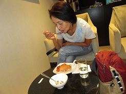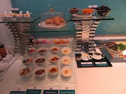| 16:50チェックインを済ませEの3階にあるオマーン航空のラウンジへ・・・ 初の中東のラウンジ、中は豪華で料理も凝っていて美味しかった。 |