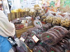 | 17:50旅装を解いている間に雨が上がったので近くの市場へ・・・ なんとびっくり、ホアヒン、カオサンと3箇所目で世界遺産の場所だが一応?田舎・・・なのでなんでも安い! マンゴーが2個10B、30円・・・ガイ(鶏)の唐揚げ35B、100円・・・肉団子1個2B,6円・・・もち米5B,15円・・・野菜炒め、ご飯付き25B,75円。たまりません・・・ |