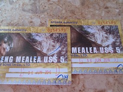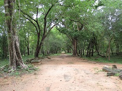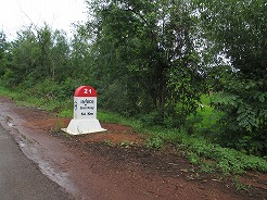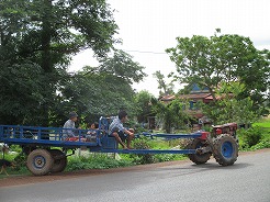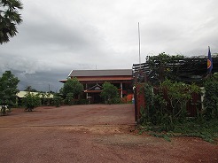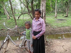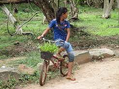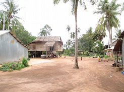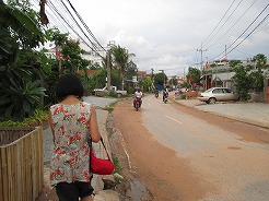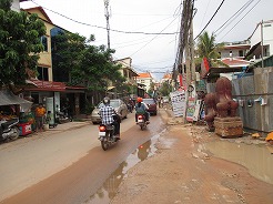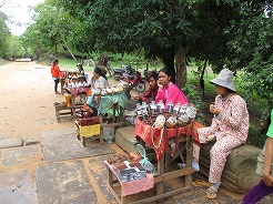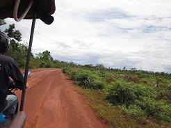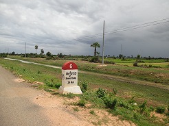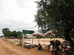 | 片道約60kmをツクツクで2時間半・・・ プノンペンまで続く国道6号線は日本の援助で完成した道路とか・・・状態がよくツクツクでもスムーズ。 この地方は雨期2回、乾季1回と年3回米を作っているそうで植えたばかりの緑がきれい。 農家は高床式の家づくりでハンモックで寝ている。そんな牧歌的な風景を見ながら10時丁度、2時間でチケット窓口着。入場料は5ドル。 |