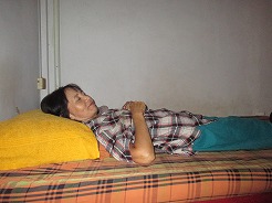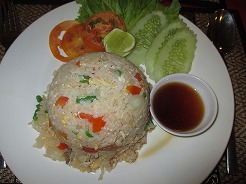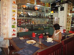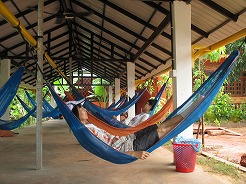 | 11:30近くのクメールレストランで食事。グリーンカレー7ドル、フライドライス7ドル 店先にハンモックが吊るしてあったので寝転ぶ・・・ |
