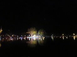 | 遺跡公園内の一番大きな池が会場とは聞いていたが池がたくさんあるので皆目わからない。 あっちの池もこっちの池もそれなりに座り込んでいる。仕方がないのでばらばらとタイ人家族が座っているあたりに陣取る。 これが大正解!この家族の話でうっすら見える小島がショーの舞台で花火もよく見える特等席だと・・・ 公園自体が会場なのでショーは無料!小島を中心に池を使い大型の船を繰り出しスコータイの歴史を繰り広げていた。最後はコムローイや花火が打ちあがり幻想的・・・ |