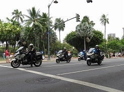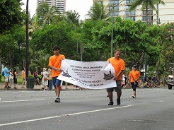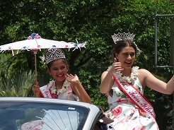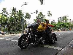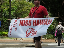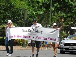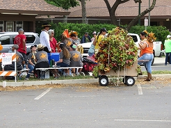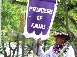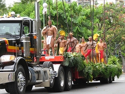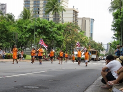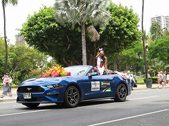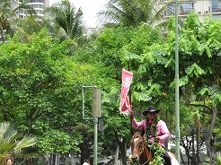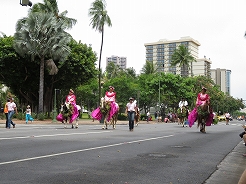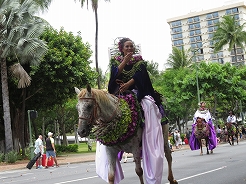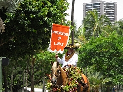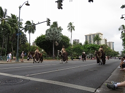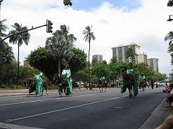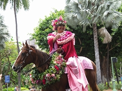 | 9時からキング・カメハメハ像スタートでカラカウア通までパレード。 カラカウア通り入口の芝生に陣取る。10:40先頭にマッチョなフロートにキングカメハメハ次にハワイアンバンド・・・次に馬に乗った女王のあと各島々のクイーン達が。途中ミス・ハワイやミスビキニなどが・・・ |
