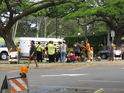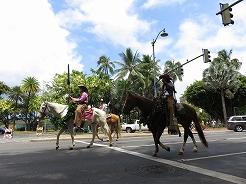 | 歩いてパレードの終点地点までアラワイ運河沿いを・・・ カピオラニ公園では出演者や馬が・・・ |
