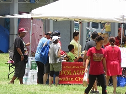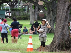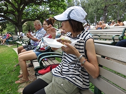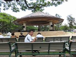 | カピオラニ公園野外ステージでは演奏が・・・昼食のランチプレートを食べながら聞く。 | ||
