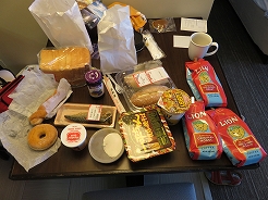 | ドンキホーテーで食料品の調達。ドンキの食パン、もちもちして美味しい。 生もののポキ(まぐろの醤油漬け)を買ったのですぐにピンクラインでホテルへ戻る・・・ |