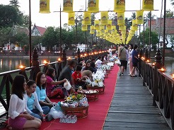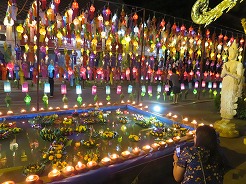 | チェンマイのロイクラトン祭りは「イーペン」と呼ばれ、ピン川を流れるクラトン(灯篭)が水上に浮かんだ天の川のように幻想的で美しいお祭りとして有名。 | ||