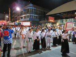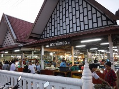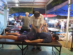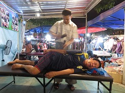 | チェンマイパレードを見るためターペー門からピン川へ歩く・・・ ピン川手前で夜店や遊技場が開かれてのぞいていると痛そうな整体?があったので受けてみた。木槌で叩かれて押しまくられて顔をゆがめて施術・・・終わった後はすっきり・・・ |