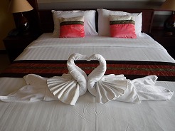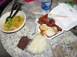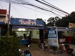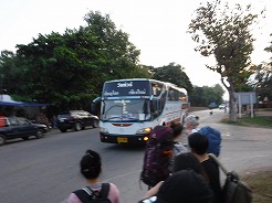 | 6:50発の10分前までにバスステーション到着なので6:15チェックアウト・・・朝食が取れないのでバナナを持って行くよう勧められた。 前の寺院では読経が鳴り響き橋の上には托鉢のお坊さんに捧げる食べ物を持った市民が並んで座っていた・・・ |