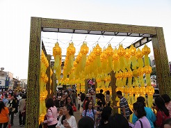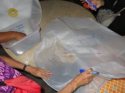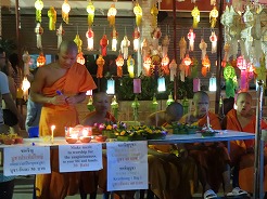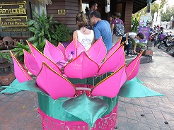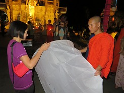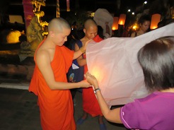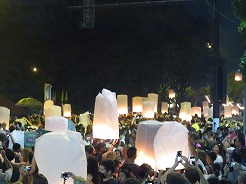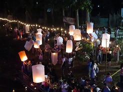| もともとは地元の方々向けの仏教のお祭りで、仏陀への感謝と、厄払いの意味も込めて夜空へコムローイ(天燈)を放つ。我が家はお寺でお坊さんに手伝ってもらって一緒に打ち上げます・・・ | ||