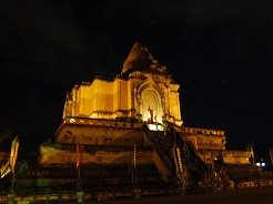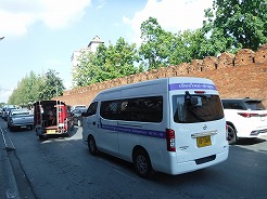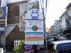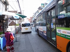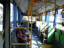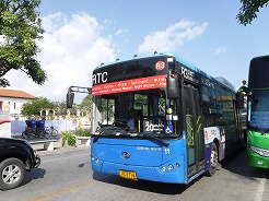 | 去年から運行しだした市内循環バス。ソンテウより安く城壁内も網羅した上ワロロット市場へも行く・・・ 今回は試しに乗ってみた。3人の王子像の前のバス停から10分待ちでRTCの目印の大型バスが停車、行き先を告げ1人20Bを支払う、約10分で到着する。エアコンが効いて快適!まだ周知されていないのか乗客は3人・・・ |