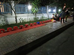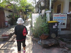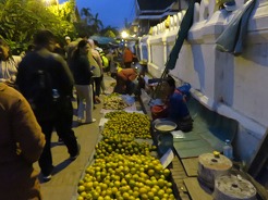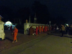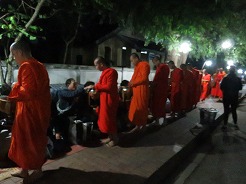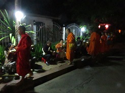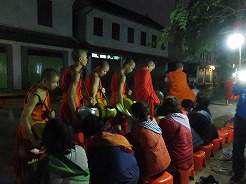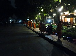| 5:00GHを出て1km先のサッカリン通まで20分・・・路上には観光客用に椅子と餅米が入ったカゴが置かれさかんに呼び込みされる。5:45一番先のお寺から順に姿が見える。次の寺院を過ぎればそこからまた僧侶が出てくる・・・ | ||