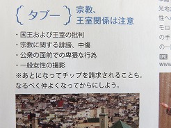 | アフリカ、サハラ砂漠と聞いて灼熱を想像していたが旅のしおりを見ると日本の初夏の季節、地図を確認すると緯度が福岡とほぼ同じ・・・と言うことで今の別府の衣服そのままの長袖を主に、サハラ砂漠では早朝の朝日を見るとかで懐中電灯が、通貨はドルとユーロに千円札が・・・預け荷物は15.8kg、これは宅配3日前に関空へ発送・・・なので自宅出発はデイパックの軽装・・・SIMはモロッコの空港で買えれば購入する。 | ||
