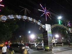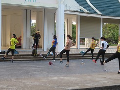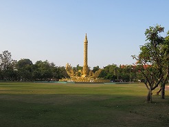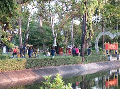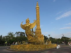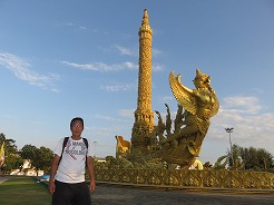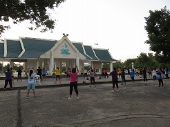 | ここはウボン市民憩いの公園、お堀の周りを走ったり歩いたりがずっと続いている。公園の中は金色の巨大なろうそく祭りの山車のモニュメントが目をひく。バスケット、サッカー健康器具、一輪車まで無料で利用できる。17時になるとインストラクターが舞台に立ちエアロビが始まる、最初10名ほどが100名ほどに・・・ | ||