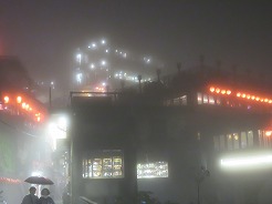 | 18:40ガスの中と到着 18:50階段を上って幻想的な広場に到着 30分自由散策の後、19:30「千と千尋の・・・」湯婆の屋敷の前にある高台のレストランで台湾の家庭料理で夕食 | ||