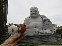 | 7:55〜8:30 日本人の遺骨を納めた場所を守るため台湾人が建てたお寺で、中国からの撤去要請を了解したふりをしてほていさん像を建てたという日本人観光客しか案内しない場所、ここで判明したのが私がほていちゃんだと言う事・・・乳首のぽっちとお腹の具合が妙に似ているそうな・・・。 |