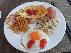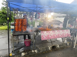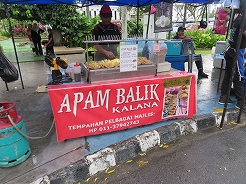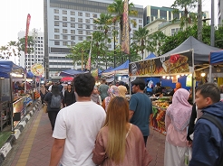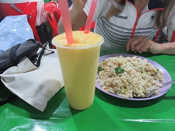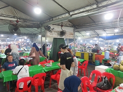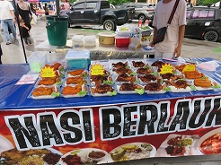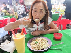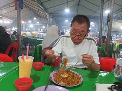 | 毎日開かれ、飲食系が多く、テーブルもありメニュー表もあって頼みやすい。鳥のナシゴレン7リンギット、シーフードミーゴレン12リンギット、マンゴージュース8リンギット・・・とにかく大きい、2人前はあるほどの量で満腹満腹に・・・ | ||